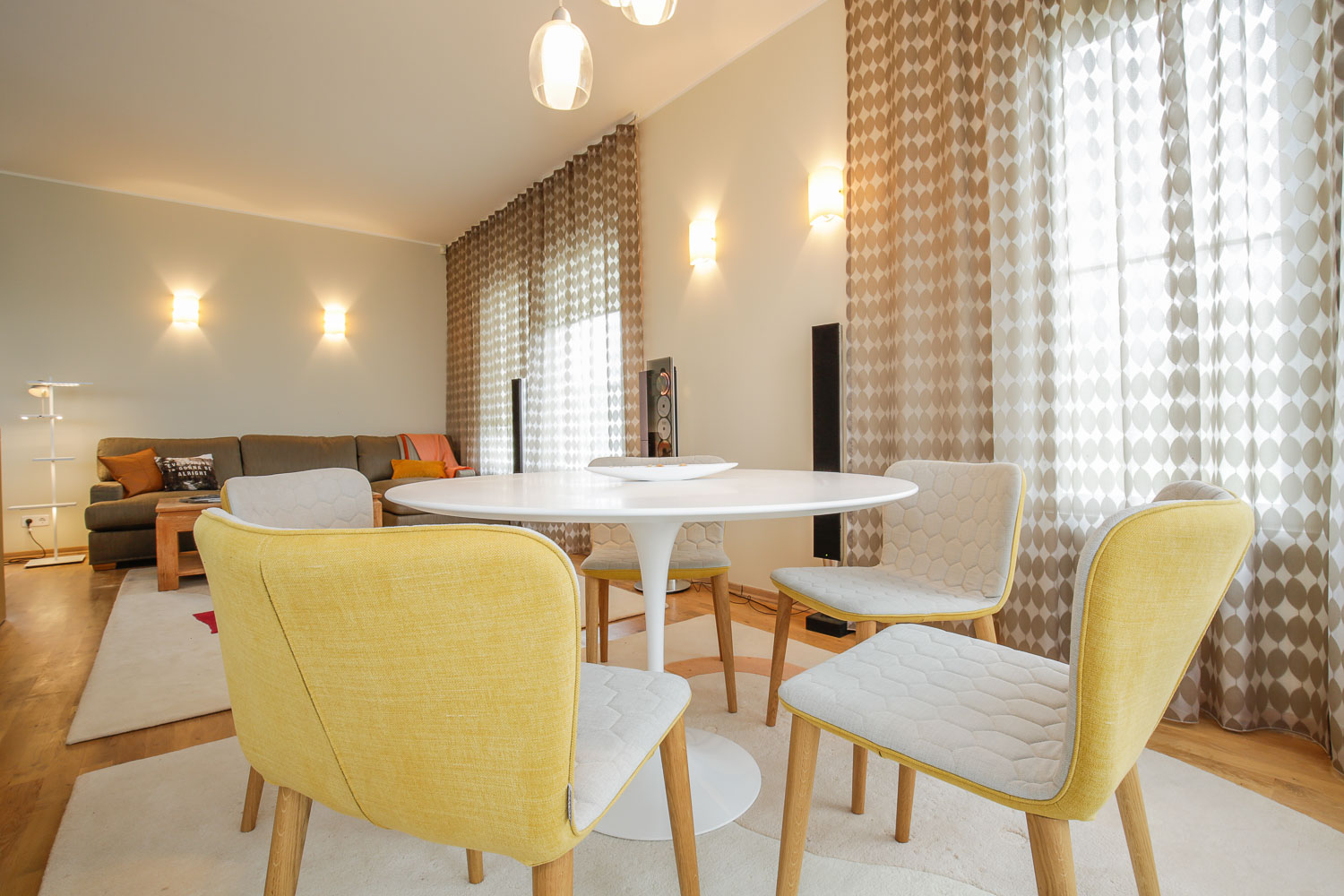 Sööginurka kaunistab Saarineni “Tulip” söögilaud ja Sancal’i TEA ülimugavad toolid.Elutoas pärast väsitavat tööpäeva vedelemiseks läksime pehme diivani teed ja leidsime sobiliku Softrendi valikust. Padjad leidsin H&M’i koduosakonnast – mulle meeldivad tekstid ja inspireerivad sloganid…”Everything is gonna be alright” on alati hea meeldetuletus 🙂Kõik aknakatted aitas valmis teha Dever – väike armas perefirma 🙂 Elutoa vaibad ja valgustid olid omanikul juba eelnevalt paigas, hetkel neid veel välja ei vahetanud, kuna sobitusid värvide ja uue interjööriga hästi.Minu salajane lemmik valgusti BOCCI 14.7Kurikuulsad isevärvitud seinad 🙂 Neid aitas nikerdada Tikkurilast leitud spetsialist. Koos üritasime tekitada sujuvat värvide üleminekut – tundub et õnnestus, sest tuppa astudes ei saa kohe arugi, et nad on eriliselt värvitud – jääb mulje huvitavast valgusemängust.