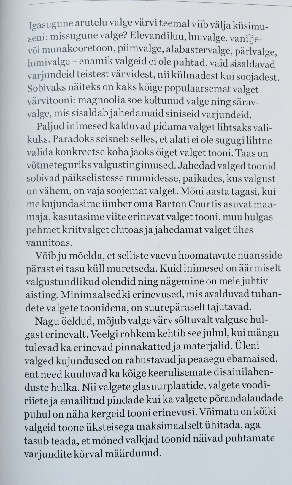 Ostsin kunagi raamatu CONRANI VÄRVIMAAILM – suurepärane ja inspireeriv raamat! Ja kuna seal on nii palju häid tähelepanekuid, siis mõtlesin alustuseks jagada teiega mõtisklusi valgest värvist, mis teoreetiliselt sisaldab kõiki teise värve. Valge on üks tänuväärsemaid värve, olles teistele värvidele kui vahendaja. Peaaegu ükskõik, mis värve on võimalik teineteisega kokku panna, kui nende vahel on valge. Tal on võime tekitada hingamisruumi, on heaks lähtepunktiks igasugusele kujunduslahendusele ning vajadusel lahjendab kirevust.