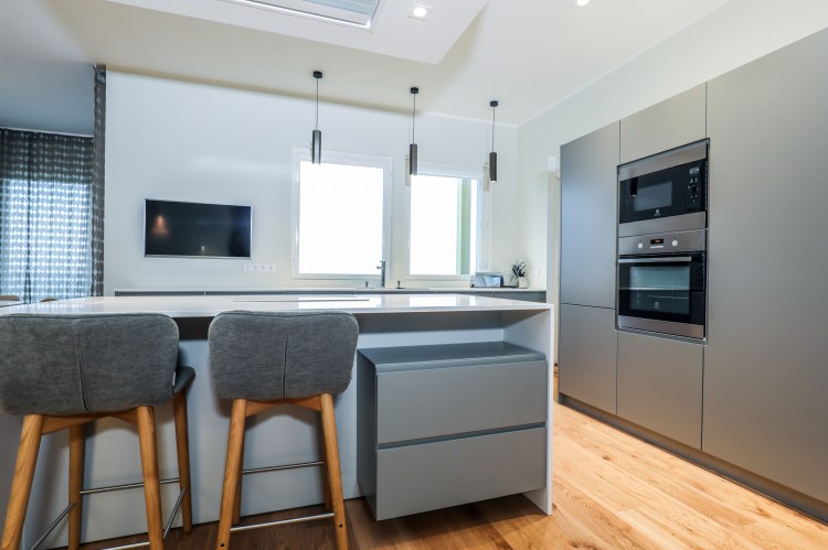 Köögis kasutasime tööpinnana Caesarstone kunstkivi “Frosty Carrina”, uksed on värvitud MDF (RAL 7030).